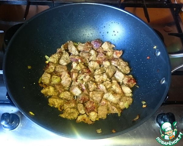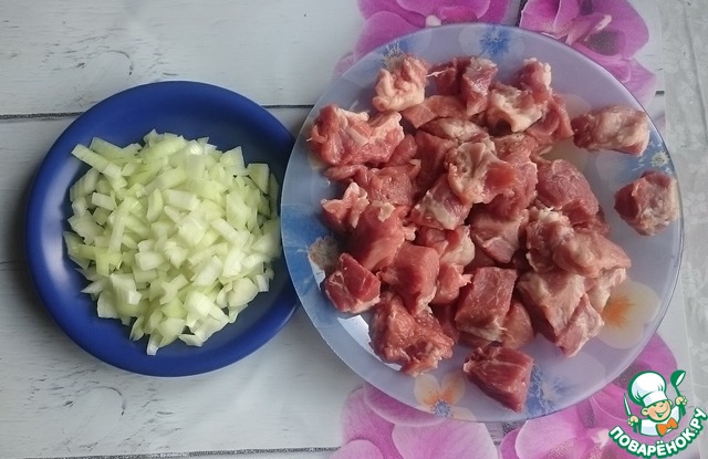 Мясо нарезаем кубиком примерно 2х2х2 см. Лук - мелким кубиком. -