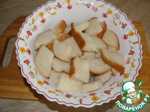 Хлеб режем крупными кубиками. Складываем в большую миску и заливаем теплым куриным бульоном. ( хлеб используем не очень черствый, средний) он должен стать как разбухшая водой губка, не в кашу, а такие мокрые хорошо куски)