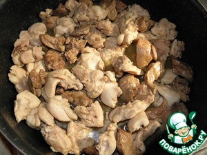 В большой сковородке нагреваем сливочное или растительное масло и обжариваем мясо с печенкой до подрумянивая. До готовности доводить не нужно! Я сначала слегка обжарила курицу, а в конце добавила печень)