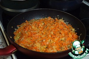 В сковороде разогреть 2 ст. л. растительного масла, спассеровать лук до легкого изменения колера. Отправить к нему морковь, перемешать, жарить на среднем огне до мягкости моркови. В конце посолить, перемешать.