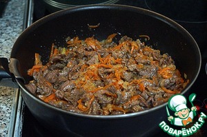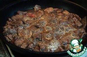Тем временем в другой сковороде сильно разогреть оставшееся масло, быстро обжарить говядину на сильном огне, постоянно перемешивая. Посолить в самом конце и сразу снять.