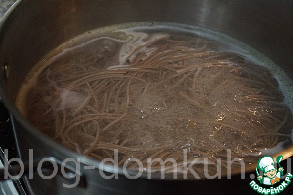 Параллельно отварить в соленой воде гречневую лапшу, как сказано в инструкции на упаковке.