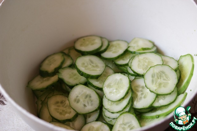 Огурец тонко нарезать (я использовала тёрку) и выложить в миску.
