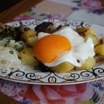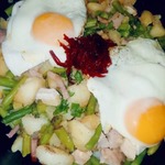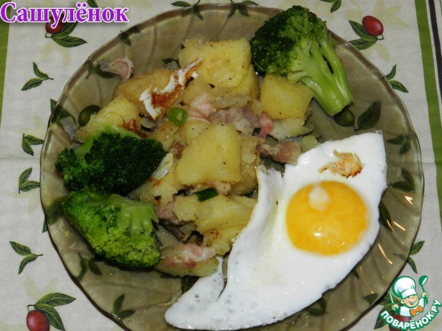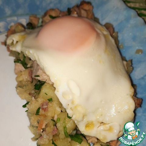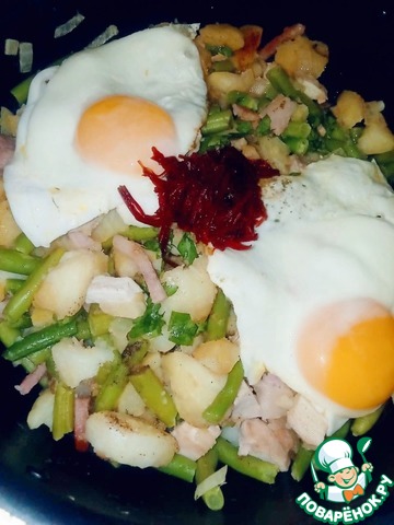 Подавать жаркое, разложив по тарелкам, дополнив яичницей, бланшированной зелёной фасолью, ломтиками маринованной свёклы (я её не стала добавлять) и сбрызнув несколькими каплями вустерского соуса.