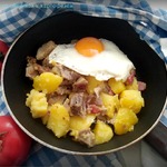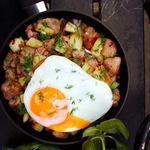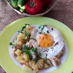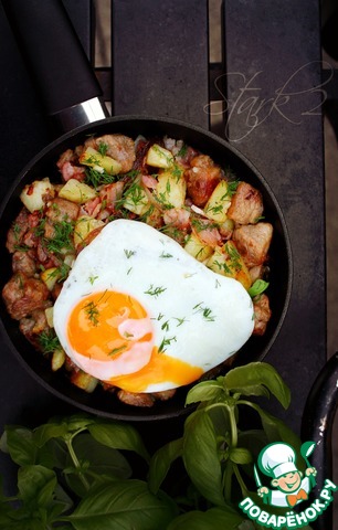 Pyttipanna. Рецепт из книги "Скандинавская кухня". В переводе с норвежского и шведского это блюдо называется «кусочки в горшке». В Дании то же блюдо зовётся Biksemad, что значит «мешанина». Отличный способ пустить в дело остатки запечённого мяса. В Швеции жаркое чаще всего делают на основе телятины или говядины и добавляют в конце немного сливок.