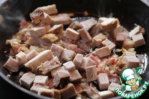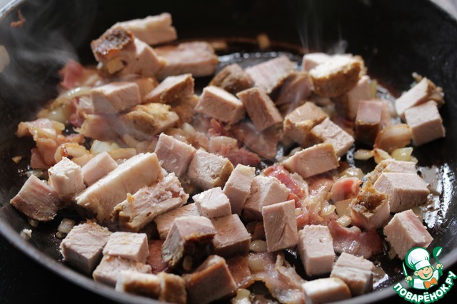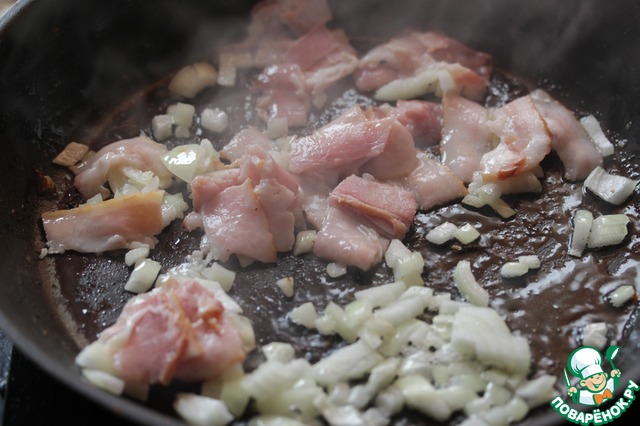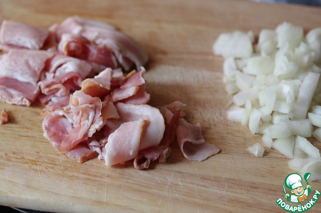 Лук нарезать некрупно, бекон – небольшими кусочками.