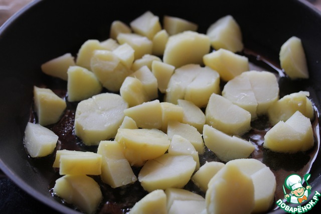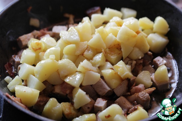 Затем аккуратно вмешать картофель (он жарится отдельно и добавляется в конце, чтобы сохранил форму и не превратился в пюре).