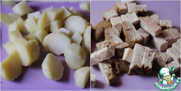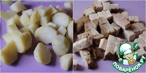 Очищенный картофель и мясо нарезать равными по размеру кубиками (ок. 1 см, я нарезала покрупнее).