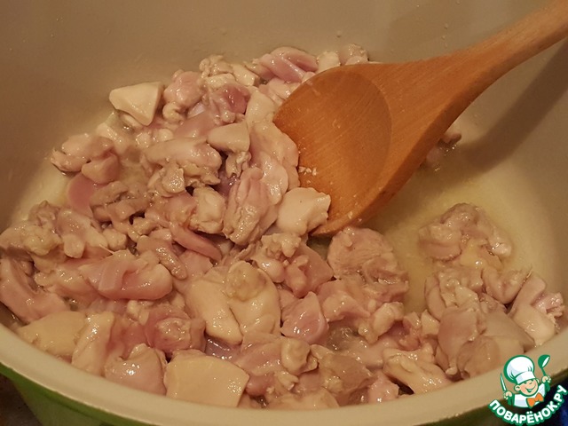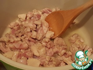 Разогреть небольшое количество масла для жарки, я использую топленое масло. Выложить нарезанное куриное филе и обжарить со всех сторон до побеления. -