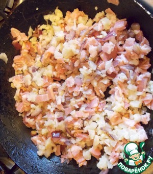 Лук и чеснок мелко порезать и обжарить в той же сковороде 3 минуты. Порезать бекон и цветную капусту. Добавить к обжаренному луку и обжарить еще 3-4 минуты. Дать немного остыть.