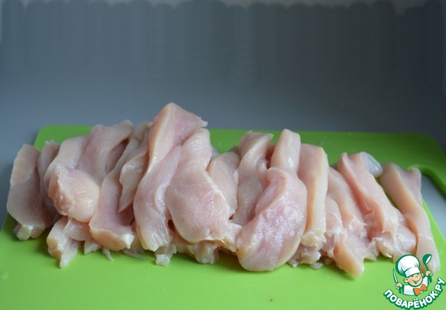 Очистите куриную грудку от жира и хрящей, разрежьте ее на полоски толщиной около 1 см.