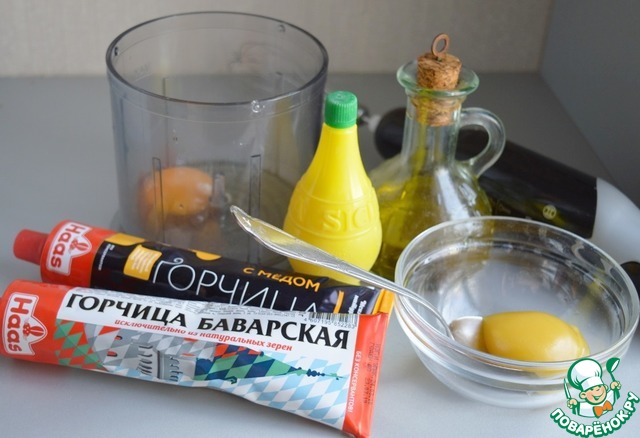Для приготовления соуса взбейте яйцо с солью, лимонным соком, двумя видами горчицы и медом, постепенно добавляя масло. Охладите соус в холодильнике.