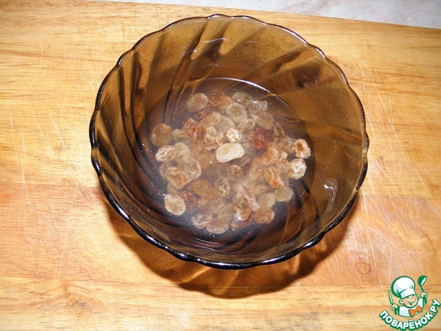 Изюм залить горячей водой с ромовым ароматизатором и оставить на 30 минут