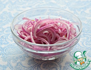 Лук нарезать тонкими полукольцами и замариновать в лимонном соке на 10-15 минут, пока мы занимаемся остальными ингредиентами.