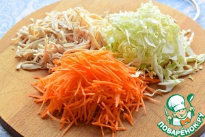Морковь нарезать тонкой соломкой или натереть на терке для корейских салатов.