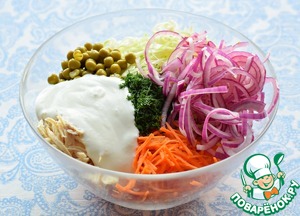 Капусту взяла пекинскую, лук мариновала в виноградном уксусе с сахаром, зеленый горошек был свежий из стручков, сваренный в микроволновке (5-6 минут в воде с чайной ложкой сахара и соли), заправляла майонезом с хреном (со сметаной наверное нежнее и вкуснее, но она некстати закончилась). Салат получился ярким и симпатичным, вполне подойдет и для праздничного стола. По вкусу легкий, но сытный. Весь вдвоем съесть не смогли, треть осталась. После холодильника уже, конечно, не так вкусно, так что в следующий раз скорректирую количество ингредиентов.