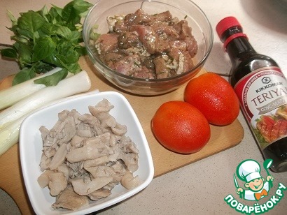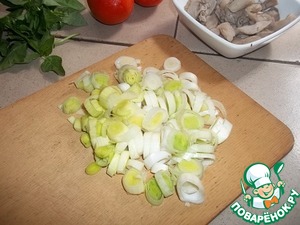 Лук-порей (белую часть) нарезать колечками. Помидор маленькими кубиками, грибы как Вам нравится (хотите вы крупные или маленькие кусочки в соусе). Зелень мелко порубить.