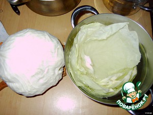 Подготавливаем капустные листы: отделяем от кочана, заливаем кипятком. Даем постоять 5-10 минут. Можно отварить 3-5 минут.