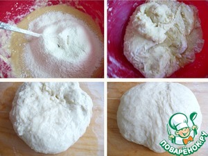 Заводить тесто сначала ложкой, потом руками, тесто собралось в комок. Влить растительное масло. Вымесить тесто до однородности.