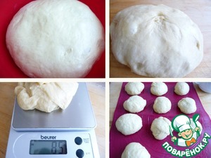 Подошедшее тесто слегка обмять и разделить на равные части, у меня 10 шт. по 85 г