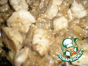 Курочку нарезаем маленькими кусочками и добавляем в грибочки. Тушим под крышкой 5 минут.