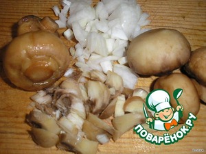 Грибочки, лук режем, наливаем в сковороду растительное масло и отправляем тушиться. -