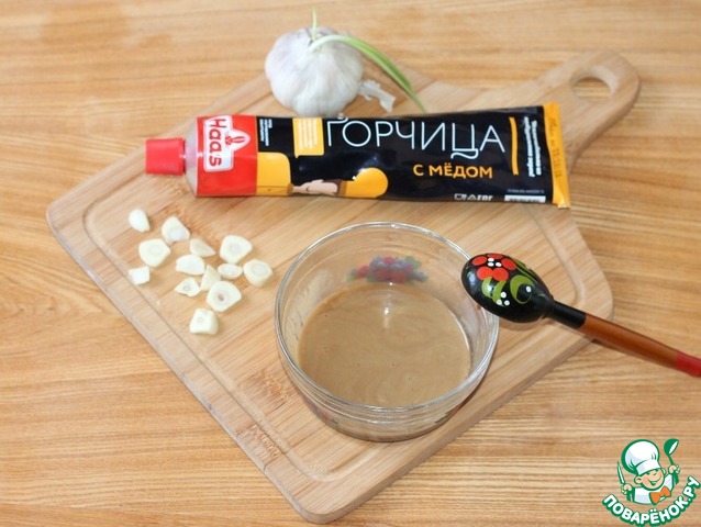 2. Приготовим соус. Смешать "Горчицу с медом, "HAAS"" с соевым соусом. Зубчики чеснока очистить и каждую разрезать пополам.