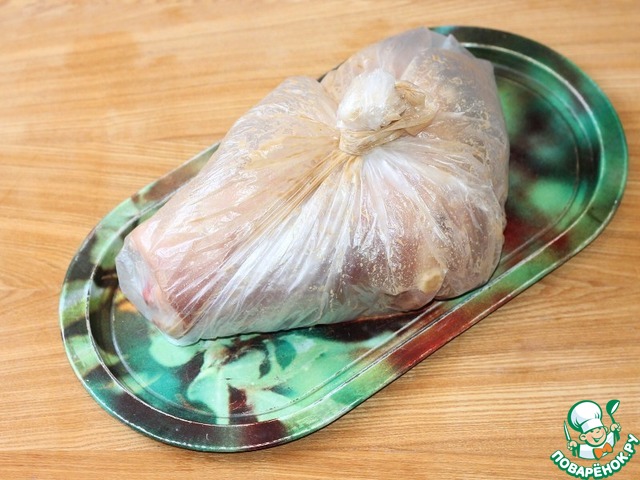 4. Положить рульку в пакет (пищевой) и завязать узел. Чтобы ароматы пряностей не пропитывали продукты в холодильнике, можно положить рульку и во второй пакет. Кладем пакет с рулькой в холодильник на 2 суток и желательно 1 раз в сутки перевернуть пакет на другую сторону.