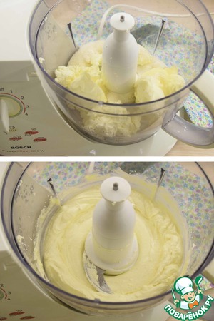 В чашу комбайна выложить сметану, творог и сахар. На средней скорости измельчить в нежную, однородную кремовую массу.