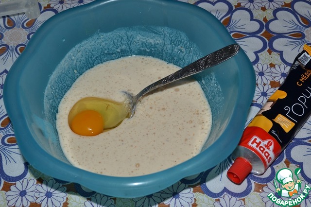 В холодную ряженку добавить горячую воду, перемешать. Смесь должна получиться тёплая, но не горячая. Добавить туда сахар, хмели-сунели, щепотку карри, готовую горчицу «С мёдом» и покрошить свежие дрожжи. Массу хорошо перемешать, чтобы дрожжи растворились.