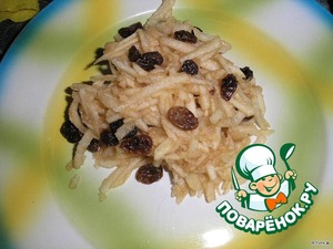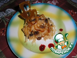 Яблочный десерт с изюмом и изюминкой. Идею подглядела в кофейне, там готовят пирожное и украшают леденцом. А вот остальное – моя фантазия. Готовилось для сыночка и очень быстро испарилось!