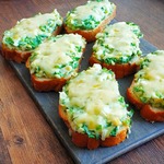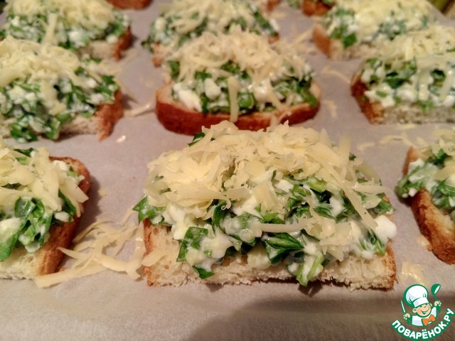 На противне разложить ломтики хлеба, нанести на них яичную массу, поставить в духовке и запекать не более 3-5 минут. Масса не должна зарумяниться. -