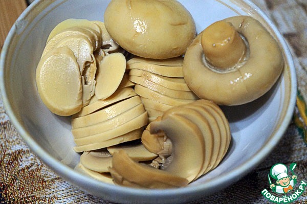 - Шампиньоны (маринованные, 1 банка) — 250 г