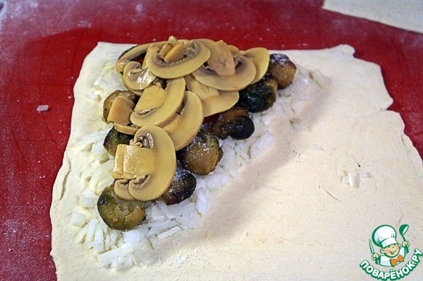 Тесто для этих пирогов мы взяли готовое слоеное, можно дрожжевое, у нас было бездрожжевое. Откровенно говоря, особой разницы не ощущаю. Вместо маринованных шампиньонов можно взять маринованные опята или маслята. Соленые грибы тоже можно использовать, но это будет совсем другой вкус.