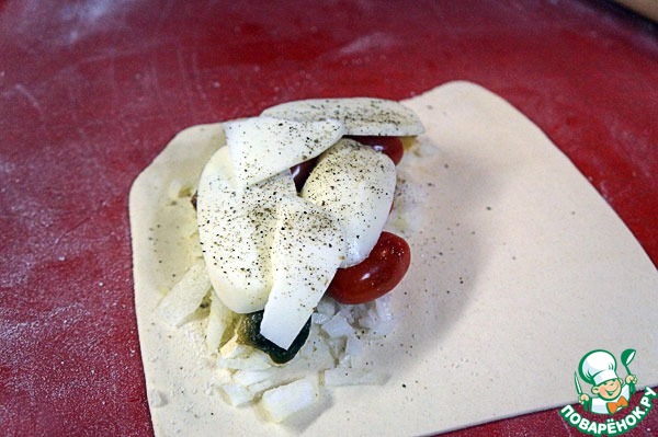 Тесто раскатать, разрезать на квадраты со стороной примерно 20 см. На тесто выложить слой лука, немного посолить, на него капусту.