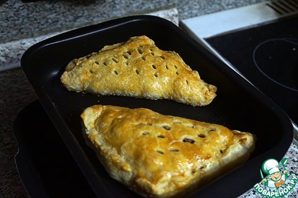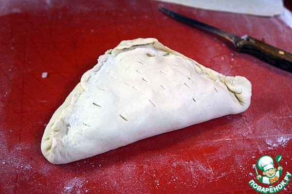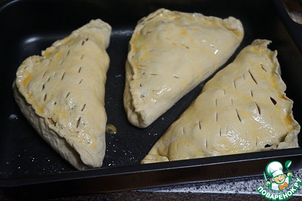 Закрыть пироги, тщательно заклеить, проделать несколько дырочек сверху.