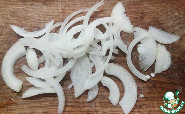 Очистить луковицу, разрезать ее пополам и нарезать тонкими полукольцами.