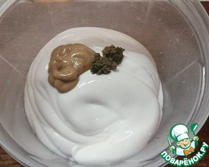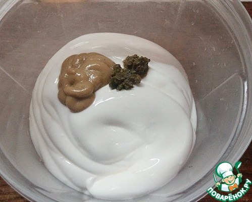 Для заправки смешиваем майонез с горчицей и соусом. Все - по вкусу. Вместо соуса я добавила немного зеленой аджики.