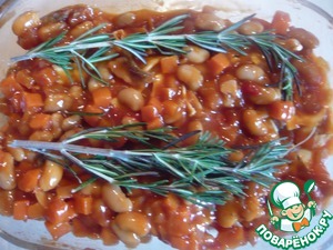 Укладываем наши орешки в смазанную маслом форму. Сверху добавляем консервированную фасоль. Ну и веточку розмарина.