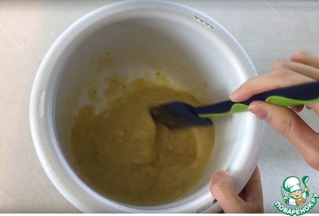 К банановому пюре добавляем яйцо, сахар, сметану, растопленное сливочное масло. Перемешиваем.