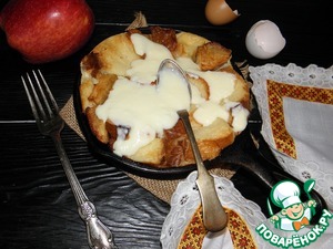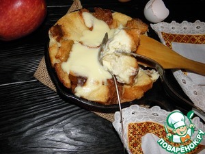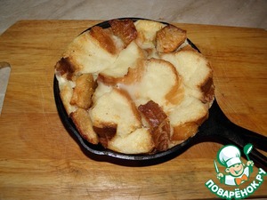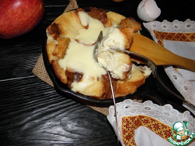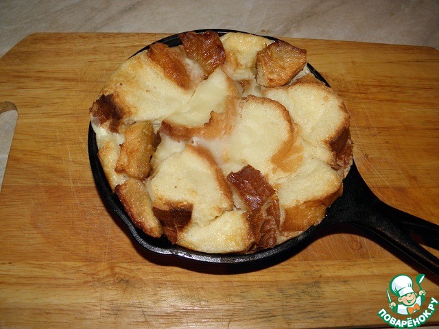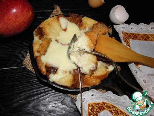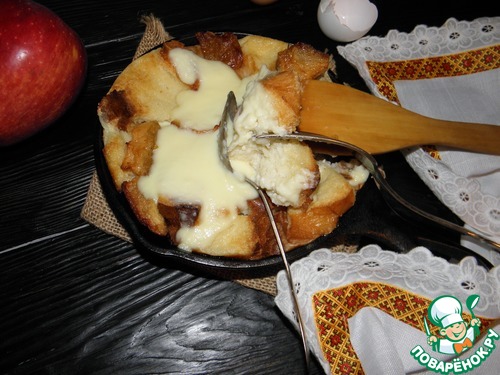 Вынуть сковороду с яблоками из духовки и выложить в нее размоченные кусочки хлеба. Полить остатком молочной смеси и отправить в духовку на 35 минут.