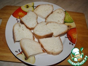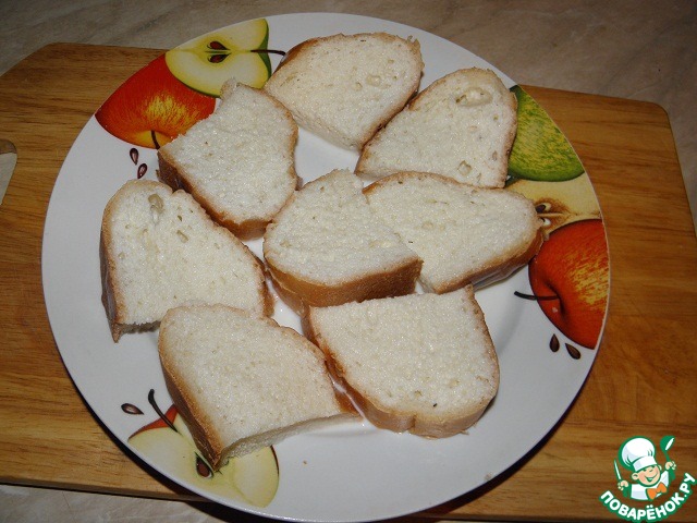 В плоскую большую миску выложить ломтики багета (слегка черствого) (в этот раз у меня другой хлеб, но лучше с багетом) и залить молочной смесью.