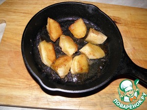 Яблоки очистить, удалить семена и разрезать на 4 части (у меня очень крупные, поэтому больше частей получилось). Растопить в большой сковороде сливочное масло и выложить яблоки. Поставить в нагретую до 180 градусов духовку на 12-15 минут. Яблоки дожны размягчиться и подпечься. Вынуть яблоки из духовки.