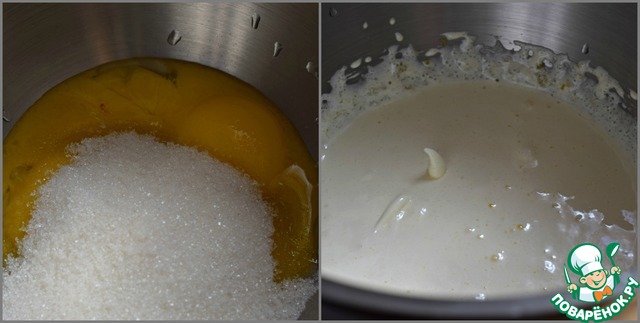 Соединить желтки с сахаром (100 г) и взбить миксером на самых мощных его оборотах до полного растворения сахара. Должна получиться белая пышная масса. -