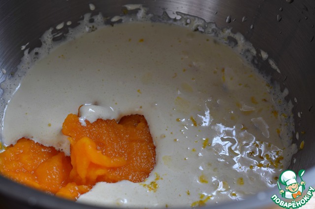 Добавить в чашу миксера (или емкость для взбивания) тыквенное пюре (120 г), влить кукурузное (подсолнечное без запаха) масло, лимонный сок и всыпать лимонную цедру. Перемешать до однородности.