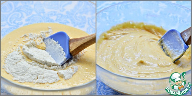 Перемешивать лопаткой аккуратно, но активно и быстро, чтобы тесто не успело опасть.