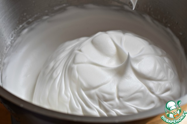 Яичные белки взбить с сахаром (оставшиеся 80 г) до увеличения массы в 4-5 раз, до плотной устойчивой пены.