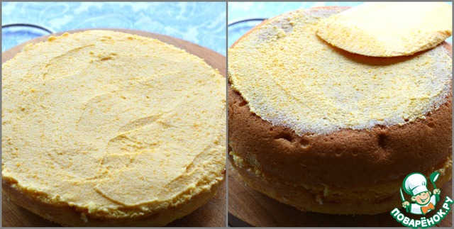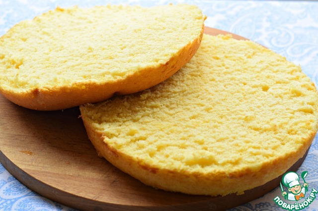 Бисквит разрезать вдоль на две части. (три или даже четыре: высота бисквита в 6 см позволяет это сделать)