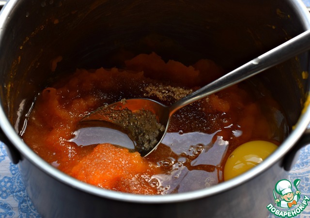 В оставшееся тыквенное пюре добавить коричневый (или белый) сахар, яйцо, лимонный сок. Кукурузный крахмал (или картофельный 1,5 ст. л) смешать с небольшим количеством воды (3 ст. л.) и влить его в общую массу. Хорошо перемешать.