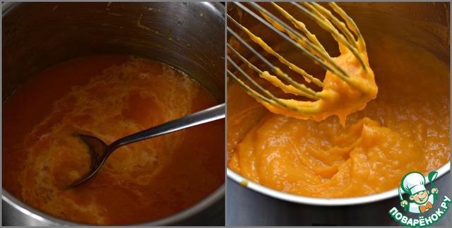 Поставить кастрюлю с тыквенным пюре на умеренный огонь и варить, ПОСТОЯННО мешая венчиком, до загустения крема. (минут -7-9) Остудить до комнатной температуры.